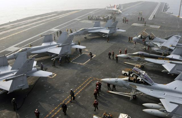 11/30/2010 - U.S. Sailors position aircraft on the flight deck during flight operations aboard the aircraft carrier USS George Washington (CVN 73), Nov. 30, 2010. George Washington was in the Korean peninsula to participate in a training exercise that reinforces U.S. commitment to Korea and regional partners in the Western Pacific. (DoD photo by Mass Communication Specialist 3rd Class David A. Cox, U.S. Navy/Released)